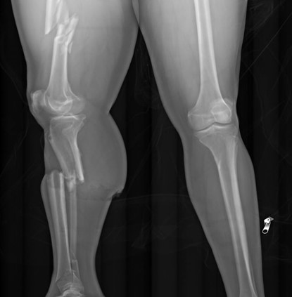 This x-ray of a pedestrian struck by a motor vehicle shows displaced fractures of the right femur, tibia, and fibula. Note the body bag zipper in the lower right corner.