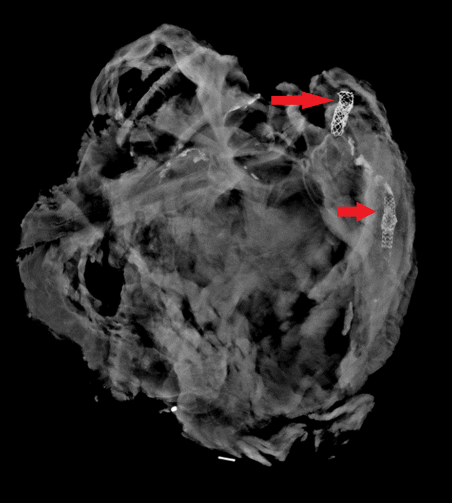 This heart was x-rayed after removal, as the decedent had a history of heart disease with prior interventions. Coronary stents (red arrows) are easily visible; in practice, they can be difficult to find on gross dissection in patients with heavily calcified arteries.
