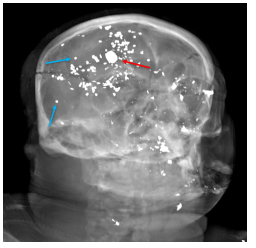 This x-ray of a gunshot wound victim shows two separate types of ammunition, seen as radio-opaque (white) in the image. The smaller, circular pieces are “birdshot” shotgun ammunition (blue arrows) while the larger pieces are traditional handgun ammunition (red arrow).