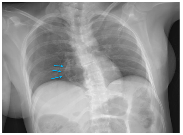 This individual had sharp force injuries to their neck, which injured large veins. The x-ray in this case was performed to see if any fragments of the weapon were still in the body, but also showed a large air embolism in the right atrium and ventricle (blue arrows), seen as radiolucency (gray/black). Open injuries to veins in the head and neck can cause air emboli as breathing creates negative intra-thoracic pressure, drawing air inward though any open channels.