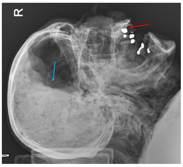 In this x-ray of a decomposed person, dental fillings are easily visible (red arrow), which are typically unique for an individual and can be used for identification. Note the irregular shapes of the fillings, which are just as important as their location. Also note the air-fluid level in the cranial cavity (blue arrow), indicating complete liquefication of the brain.