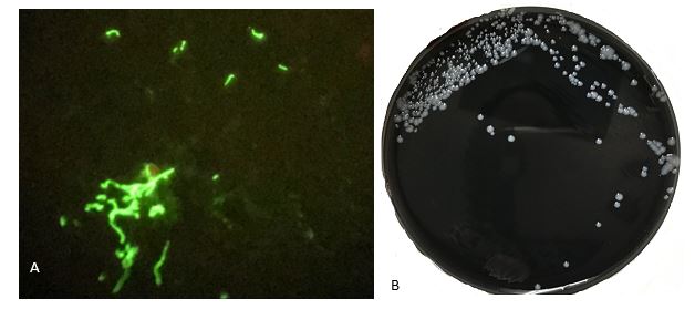 Upon admission, physical examination showed decreased breath sounds and coarse crackles in the right lower lung field. His blood test results were unremarkable. Chest X-ray and CT scan showed diffuse reticular pattern and a 4 cm cavitary lesion in his right lower lobe (Image 1). Brochoalveolar lavage fluid, sputum as well as blood were submitted to microbiology lab for bacterial, fungal and mycobacterial culture.