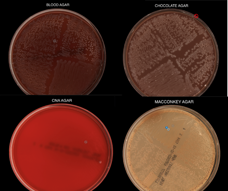 There is an established association between C. gattii and infections in immunocompetent hosts, and recent evidence points to genetic and immunological factors which predispose some individuals to C. gattii infection. Possible differences in clinical course and patient outcomes have been suggested to justify differentiation between C. gattii and C. neoformans in laboratory settings. Importantly, routine laboratory methods such as commercial biochemical identification systems, morphological observations, and cryptococcal antigen testing lack the discriminatory power to distinguish these species.2 By contrast, MALDI-TOF MS and molecular methods, including some molecular panels performed on positive blood culture bottles, are able to discriminate between C. gattii and C. neoformans. The use of glycine as a sole carbon and nitrogen source in the presence of canavanine allows biochemical differentiaton through the use of CGB agar. The degredtation of L-canavanine to ammonia in the presence of glycine by C. gattii raises the pH and results in associated color change, while C. neoformans remains a yellow or green color (Image 1C). While robust, this incubation can take up to five days resulting in prolonged turn around times.2