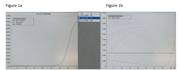 Following multiple emails and conversations with the manufacturer scientific liaison in which we reviewed each curve that was questioned, we did not change our response to the provider. However, we gained valuable insight into what an instrument contaminant would look like and we simply did not see any of that. We saw clean curves that came up at later cycles.