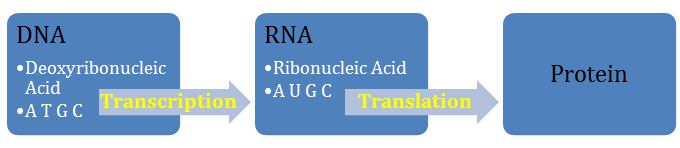 A T G C bases, along with a sugar, and a phosphate group combine to form a polymer of nucleotides. This polymer backbone of alternating sugar and phosphates is what we call DNA (Deoxyribonucleic Acid). DNA is transcribed to RNA (Ribonucleic Acid) which instead of Thymine (T) contains a Uracil (U). Finally, RNA is translated to protein.