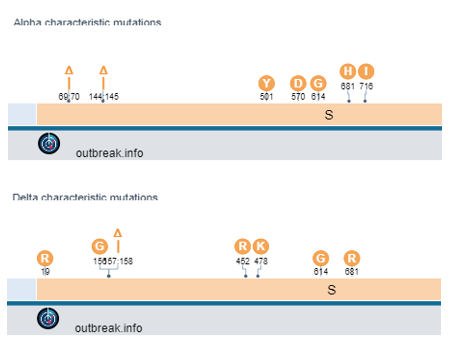 Figure 1. Characteristic mutations of Alpha (top) and Delta (bottom) variants. The deletions (triangle sign) are located close to each other, so were evaluated for phase. Figure 2. Integrated Genome View (IGV) display of mutations. 6 base pair deletion (bars next to 6) is characteristic of Delta while a 3 base pair deletion (bars next to 3) is characteristic of Alpha.