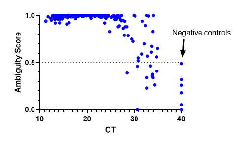 We have also implemented bioinformatic QC metric cut-offs to determine where a cut-off for negative specimens should be. We decided on an ambiguity score <0.5. The results were consistent with previous findings where lineages could be assigned at a CT >30, but sometimes they failed as CT values increased. Negative controls were assigned a CT of 40 and all fell below the 0.5 cut-off. This has been a useful metric to be sure we are providing high quality results.