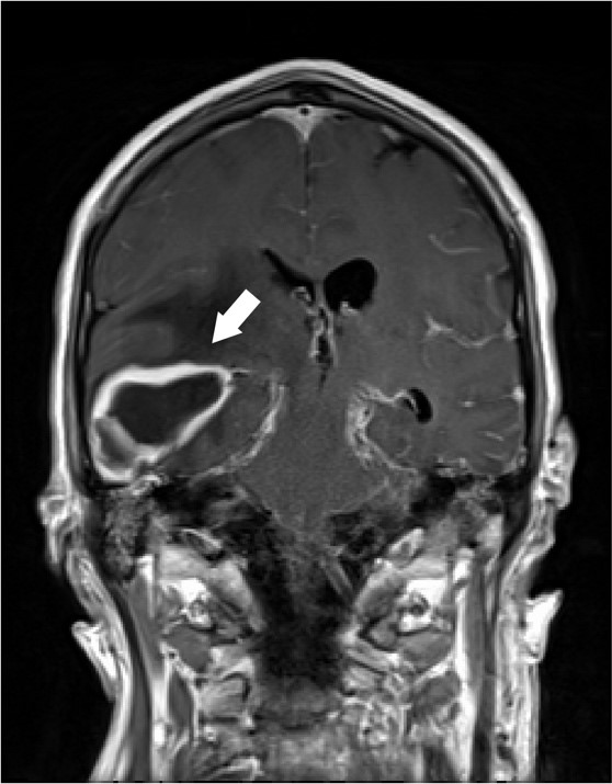A 62 year old male with unknown past medical history was dropped off at the emergency department by EMS after being found altered with concern for IV drug use. On presentation he was febrile to 104.5o F, tachycardic, and although he was initially responsive, his mental status deteriorated. Labs were drawn and broad-spectrum antibiotic coverage with vancomycin, cefepime, and metronidazole was initiated in the ED. He then had a tonic-clonic seizure event and was given intravenous levetiracetam. A CT brain showed a right inferior temporal lobe lesion, initially interpreted as likely glioblastoma multiforme, causing subfalcine and uncal herniation. MRI revealed a ring-enhancing mass measuring 3 cm x 3 cm x 3 cm in the right temporal lobe with significant surrounding edema. CT of the temporal bones also revealed right mastoiditis (Figures 1 and 2).