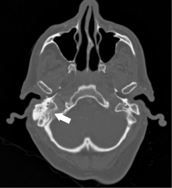 Figure 1. Coronal T1 post-contrast MRI demonstrating the ring-enhancing mass in the right temporal lobe (arrow). Figure 2. CT of temporal bones with IV contrast demonstrating opacification of the right mastoid air cells and abnormal soft tissue within the epitympanum (arrow).