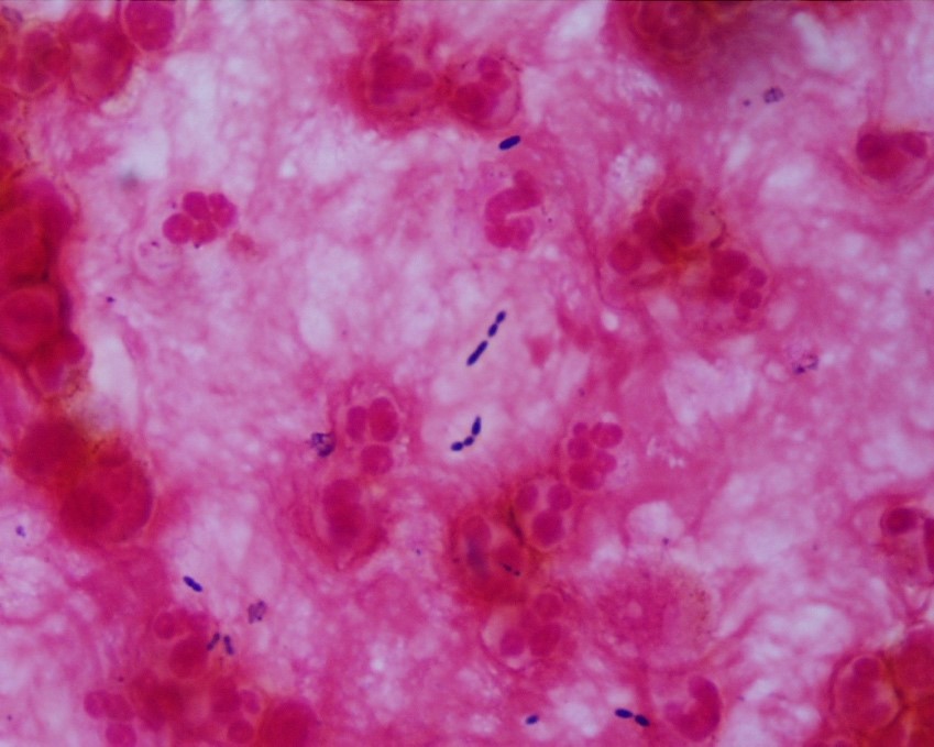 Figure 3. Representative Gram stain of the pus drained from the abscess. Multiple couplets of lancet-shaped gram positive organisms identified. Slight halo around the bacteria suggests the presence of a capsule.