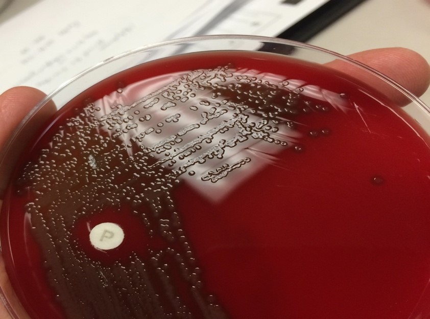Figure 4: Representative, archival image of a blood agar plate with alpha-hemolytic, centrally umbilicated colonies and optochin susceptibility (P disk).