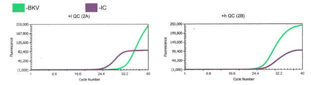 We perform a BKV LDT assay here using Diasorin reagents and instrumentation. The green line is BKV target while the purple line is the internal control (IC). We run a low positive, high positive, and negative control with every run. Director review for all control and patient results is required. We use commercial BKV positive controls, which have established acceptable range that the quantification of controls must fall within for the run to be considered valid.