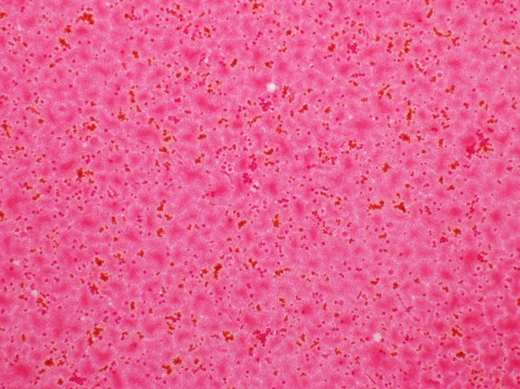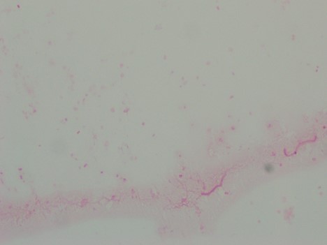 The patient underwent incision and drainage of his right hip to relieve the swelling, and samples were collected for Gram stain and aerobic and anaerobic bacterial culture. Blood was also collected from two separate sites for culture. The blood cultures showed no growth following 5 days of incubation. Gram stain of the effusion showed 4+ WBC with no organisms seen (Image 2). The joint fluid was set up for aerobic and anaerobic bacterial culture. Anaerobic bacterial culture showed no organism growth. However, a few small, grey-ish mucoid colonies grew in the first quadrant on Chocolate agar in the aerobic culture (Image 3). Gram stain was performed on one of the colonies (Image 4). MALDI-TOF confirmed the identification of Neisseria gonorrhoeae.