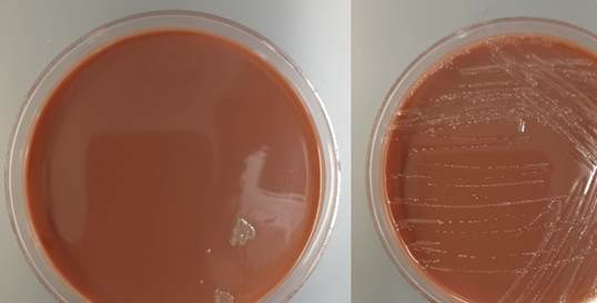 Image 2. Gram stain of effusion obtained from the right hip joint showing increased WBCs. Image 3: Left) Bacterial growth on the Chocolate agar plate. Right) Bacterial growth subcultured on another Chocolate agar plate.Image 4: Gram stain of one of the colonies that grew on the Chocolate agar. The Gram stain showed organisms shaped like coffee-beans.