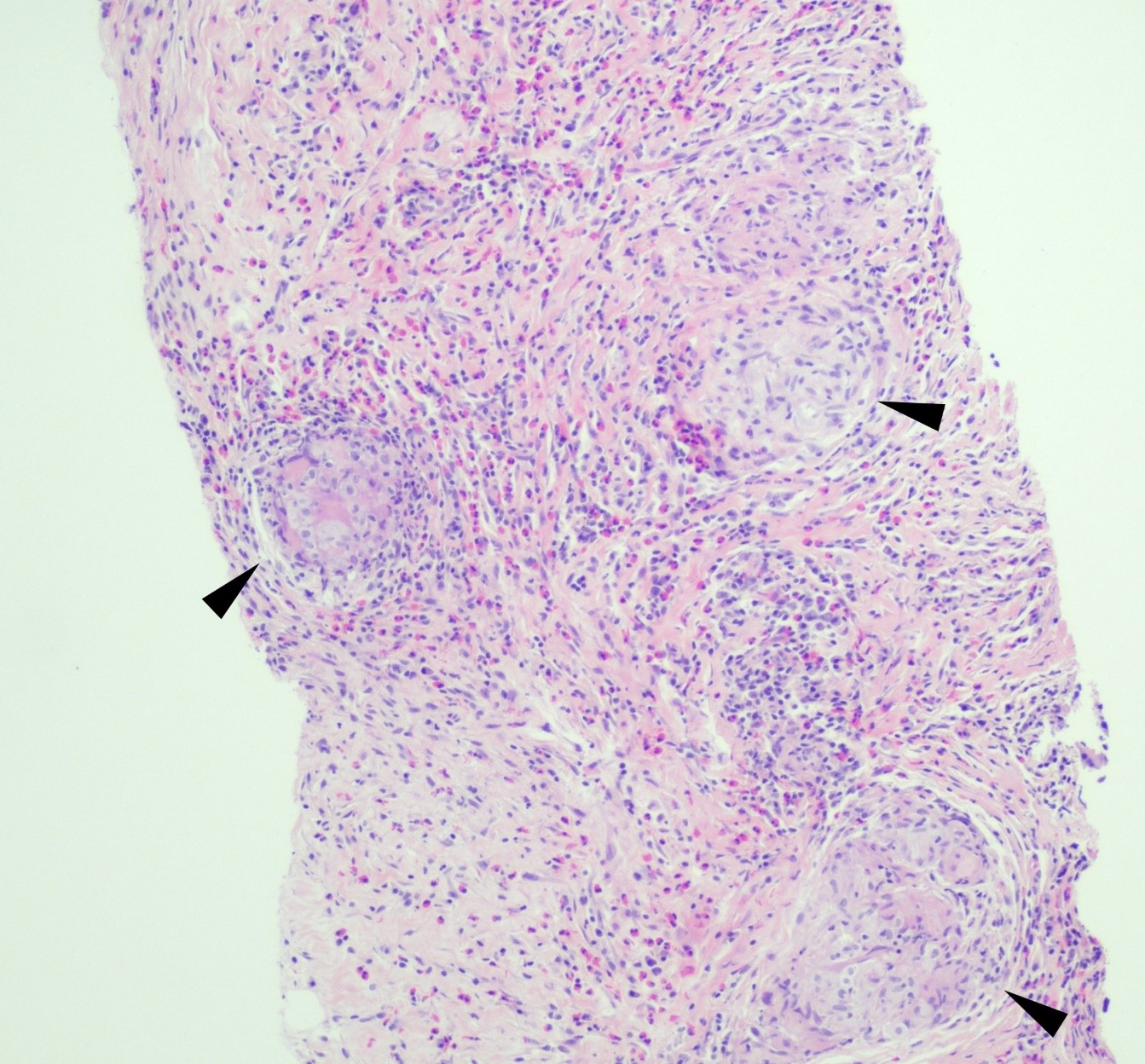 Figure 1. Core biopsy of omental tissue revealing granulomatous inflammation and diffuse eosinophilic infiltrate in a background of chronic inflammation, lymphocytes and fibrosis. Arrows indicate granuloma formation (H&E, 100x).Figure 2.Core biopsy of omental tissue revealing a spherule with its thick wall containing endospores in a granuloma (GMS, 400x).