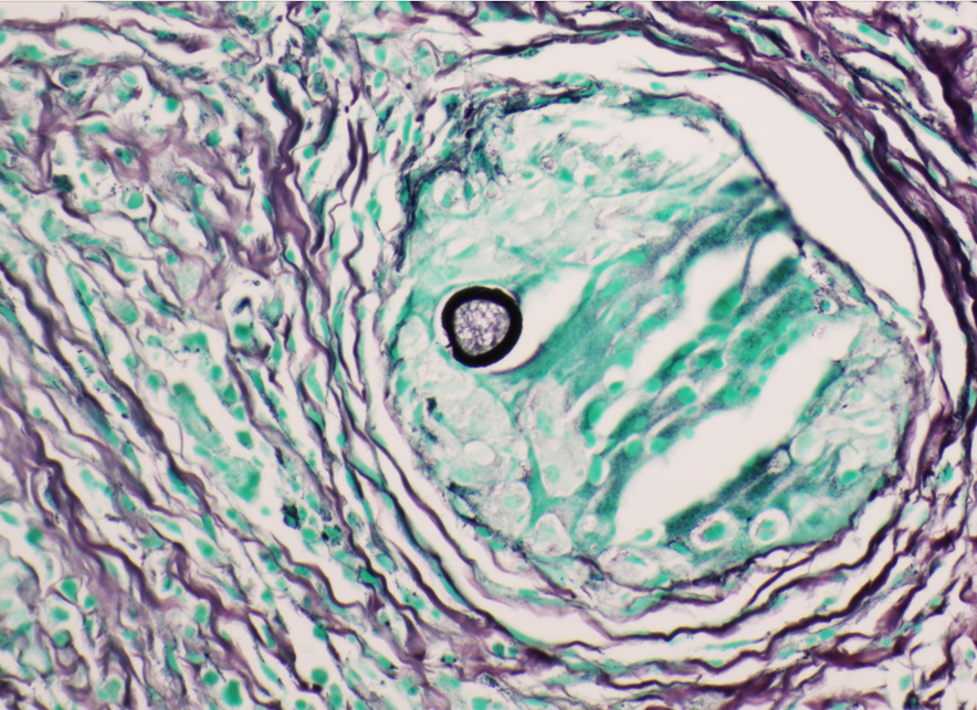 The pathophysiology of Coccidioides infection requires inhalation of arthroconidia which may result in pulmonary disease. Once inhaled, the organism forms an endospore-filled spherule in host tissue. Mature spherules rupture and disseminate endospores into surrounding tissue, which can then undergo additional replication cycles within the host. Symptomatic pulmonary disease appears to be related to fungal burden and usually presents with fever, fatigue, cough, pleurisy, and dyspnea, or less commonly peripheral eosinophilia and high erythrocyte sedimentation rate.3 Extrapulmonary disease, also known as disseminated coccidioidomycosis, is observed in <1% of cases. Extrapulmonary spread may develop in the meninges, skin, bone, or joints via hematogenous or lymphatic spread. Rarer sites of disease include the peritoneum, glandular tissue, visceral organs, bone marrow, reproductive organs, the pericardium, kidney, and the bladder.3,4