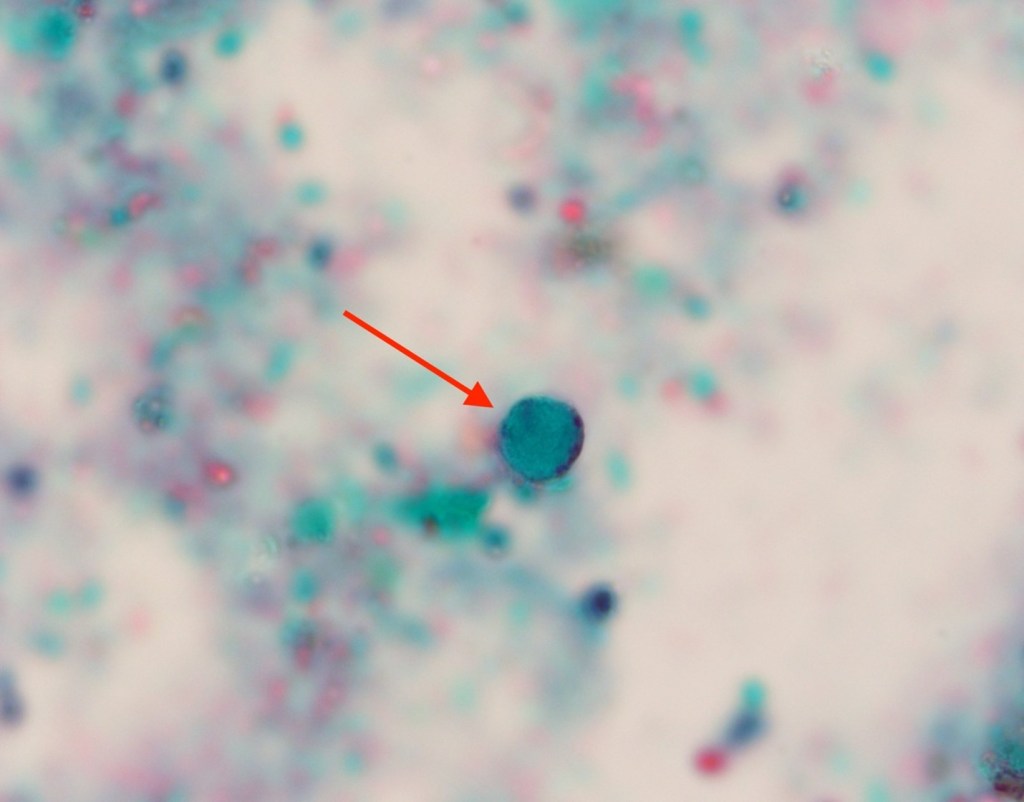 Figure 1. Blastocystis spp. organism found in the most recent ova and parasite exam.Figure 2. Another Blastocystis spp. organism found in the most recent ova and parasite exam (circled in red). The organism is in the vacuole form, with three nuclei visible on the periphery.