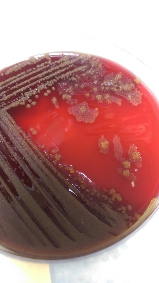 Figure 3. Growth of mucoid, α-hemolytic bacterial colonies on 5% sheep blood agar. The mucoid colony morphology suggests this isolate is likely serotype 3.