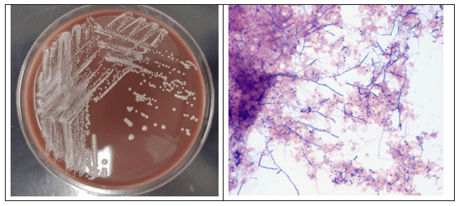 Images of Sheep’s blood agar plate showing white, dry colonies (left) and Gram stain highlighting beaded, branching filamentous bacteria after culture in MGIT broth (right).