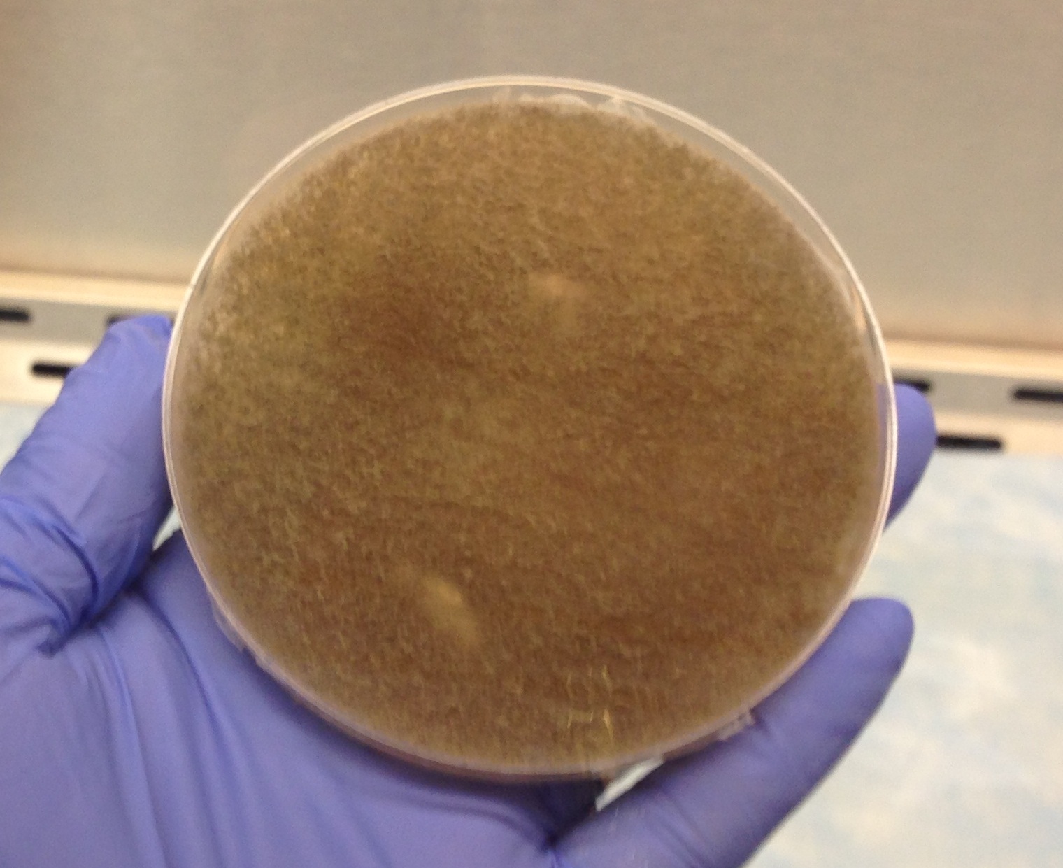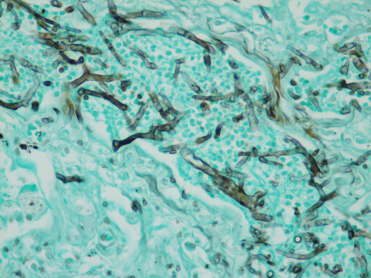 59 year old male with a history of acute myeloid leukemia, status post allogeneic bone marrow transplant complicated by graft-versus-host disease and relapse presented to the ED complaining of flank and back pain. His work-up identified multiple pulmonary lesions, thought to be infarcts and a left upper extremity deep vein thrombosis. He was started on cefepime for neutropenic fever and lovenox for the emboli. His symptoms worsened and imaging revealed progressive lesions in the lung that were concerning for invasive aspergillosis. A biopsy of one of the lesions was non-diagnostic but an aspergillus serum antigen test was positive. He was started on voriconazole. He remained hospitalized and began showing improvement, but then again developed a febrile neutropenia and became hypotensive with a decreased hemoglobin level. A CT of the abdomen showed typhlitis in the cecum and possible liver phlegmons, and a CT of the chest showed bilateral pulmonary effusions. He went into respiratory failure and passed away. An autopsy was performed and they sent lung tissue for fungal cultures.