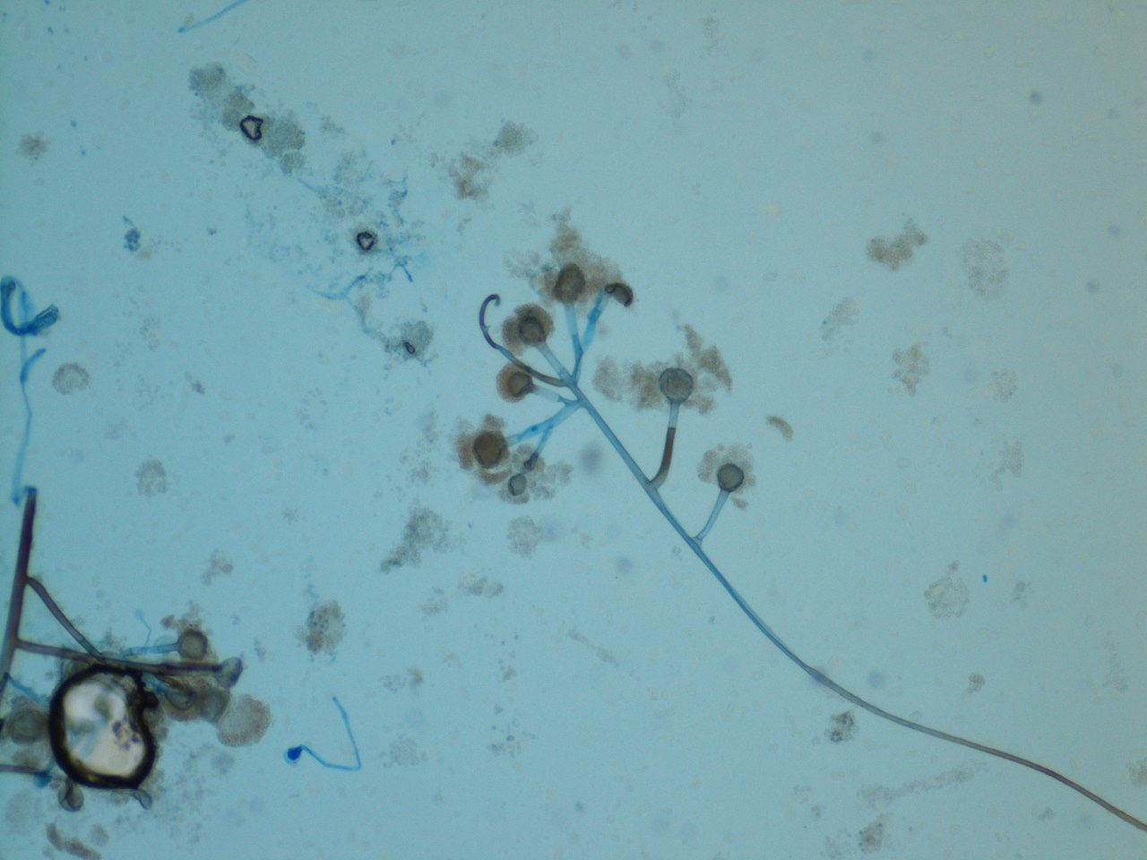 Zygomycetes produce large, ribbon-like hyphae that are irregular in diameter and contain occasional septae. Classification of specific organisms relies on identifying the characteristic saclike fruiting structures called sporangia. The sporangia produce sporangiospores, which are within the sporangia and are spherical and yellow or brown. Each sporangium is formed at the tip of a sporangiophore which is a supporting structure. The sporangiophores are connected by hyphae with occasional septations called stolons. These are contact points where rootlike structures called rhizoids attach to the hyphae. The presence and location of the rhizoids helps to identify the organism. Rhizopus has unbranched sporangiophores with rhizoids at their base where the stolon arises. Mucor has singularly produced or branched sporangiophores that have round sporangium filled with sporangiospores at their tips. It does not have rhizoids or stolons. Absidia has rhizoids that are between sporangiophores, and the sporangia are pyriform and have a funnel-shaped area called apophysis at the junction of the sporangium and the sporangiophore. Usually a septum is formed in the sporangiophore just below the sporangium. Our microscopic exam did not show any rhizoids at first, but a second exam after a longer growth period showed potential rhizoids at the base of the sporangiophores, which would lead us to have Rhizopus on our differential. Our case did not clearly define itself at the species level, so it was signed out as a Zygomycete and there were no treatment implications.