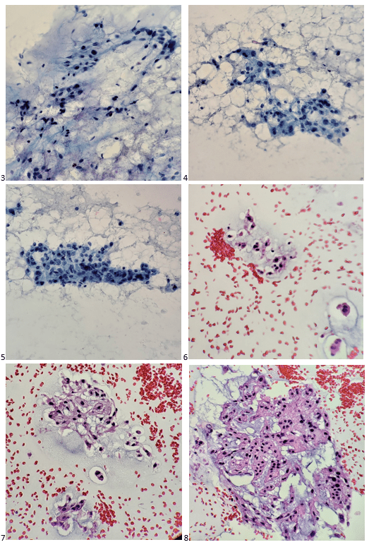 Upon screening the cytopreparations, we observed very obvious malignant cells (Image 1). It was evident that we had a two-cell population. One of the cell populations was characterized by cohesive clusters of relatively uniform tumor cells (Image 2 & 4) and the second cell population was less cohesive with larger pleomorphic cells (Image 3 & 4). Hmm, something doesn’t make sense here. We already have a group of tumor; the other cells are supposed to be benign mesothelials cells. Is there a mixed morphology going on? Like a combined small cell carcinoma and non-small cell carcinoma that we might see in lung cancer? It’s not small cell though. These two populations are clearly two adenocarcinomas. That still can’t be. There has to be a population of mesothelials. No, no… the benign mesothelials are scattered throughout the background. It looks like a double-malignant three-cell population!