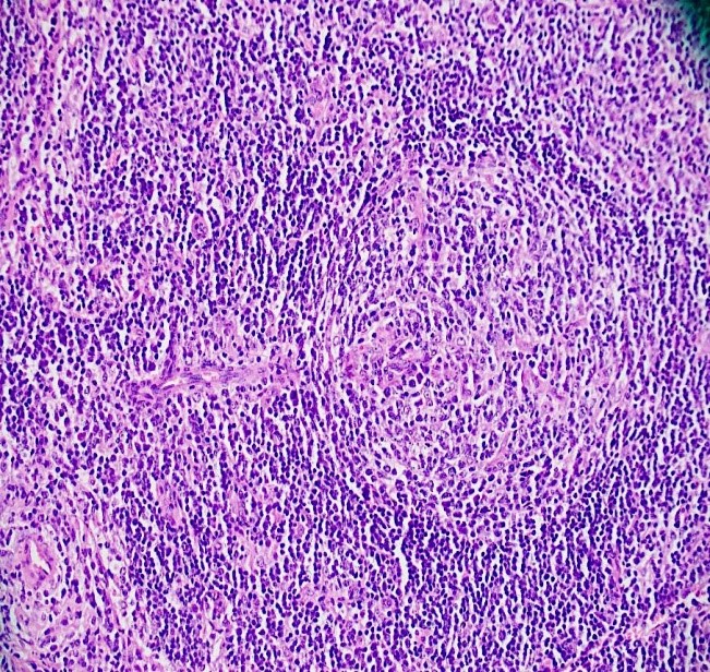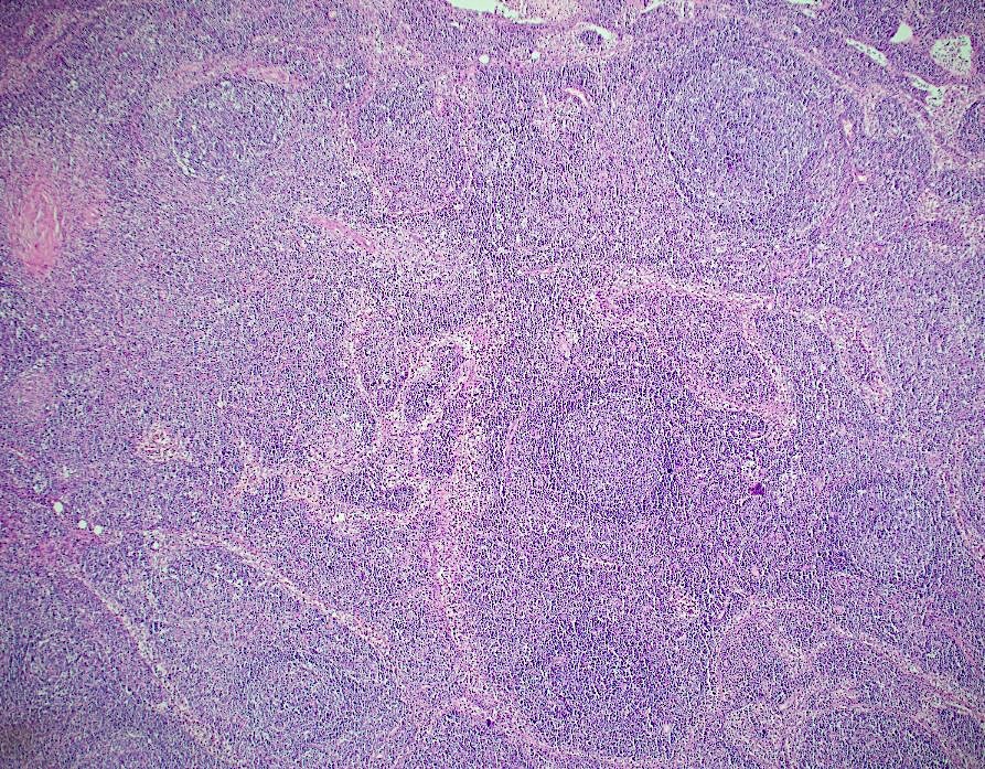 Lymph node involvement by CLL/SLL will typically show a diffuse proliferation of small lymphocytes with effacement of the normal nodal architecture. The small lymphocytes have round nuclei, clumped chromatin and scant cytoplasm. Scattered paler areas known as proliferation centers are characteristic of this entity. The proliferation centers are composed of a mixture of cell types including small lymphocytes, prolymphocytes and paraimmunoblasts. Prolymphocytes are small to medium in size with relatively clumped chromatin, whereas paraimmunoblasts are larger cells with round to oval nuclei, dispersed chromatin, eosinophilic nucleoli and slightly basophilic cytoplasm. Some cases show increased and enlarged proliferation centers with a higher proliferation rate. This must be distinguished from large cell transformation.1