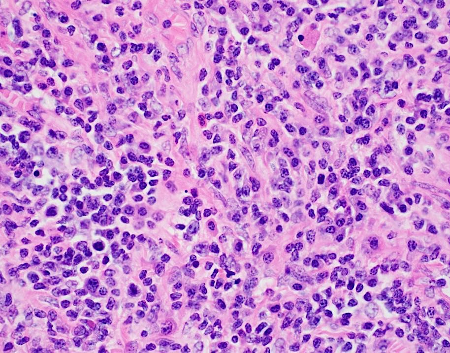 Aggressive features of CLL/SLL include proliferation centers that are broader than a 20x field or becoming confluent. An increased Ki-67 proliferation >40% or >2.4 mitoses in the proliferation centers can also portend a more aggressive course. These cases tend to have worse outcomes than typical CLL/SLL and better outcomes than cases that have undergone Richter transformation to diffuse large B-cell lymphoma (DLBCL). Transformation to DLBCL occurs in 2-8% of patients with CLL/SLL. Less than 1% of patients with CLL/SLL develop classic Hodgkin lymphoma (CHL). In order to diagnose CHL in the setting of CLL/SLL, classic Reed-Sternberg cells need to be found in a background appropriate for CHL, which includes a mixed inflammatory background. The majority of these CHL cases will be positive for EBV.1