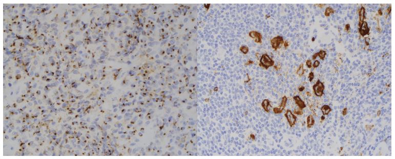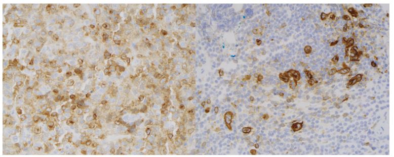 Richter’s transformation is defined as an aggressive evolution of CLL. While the most common type of transformation is to a high-grade B-cell Non-Hodgkin lymphoma, other histological transformations have been described. This includes CHL, lymphoblastic lymphoma, hairy cell leukemia and high-grade T-cell lymphomas. The prognosis for patients who present with transformation to CHL is poor compared to de novo CHL.2 A large study from the M.D. Anderson Cancer Center described 4121 patients with CLL/SLL and found that only 18 patients or 0.4% developed CHL. The median time from CLL to CHL diagnosis was 4.6 years. Fourteen of the patients received chemotherapy. The overall response rate was 44% with a complete response rate of 19%. The median overall survival was 0.8 years and all patients eventually died from disease recurrence or progressive disease.3 This dismal prognosis is similar to patients with Richter transformation to DLBCL and much worse than patients with de novo CHL, which is curable in >85% of cases.1