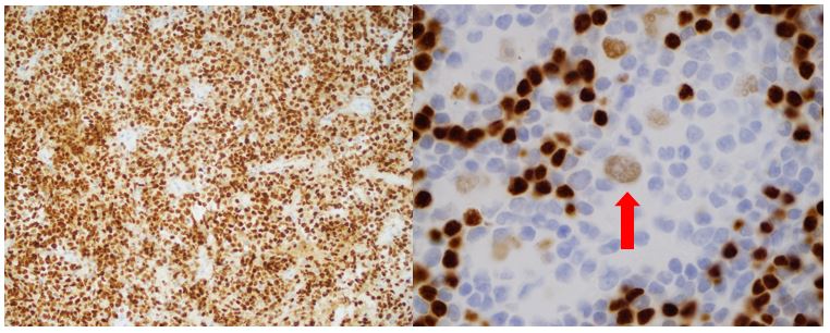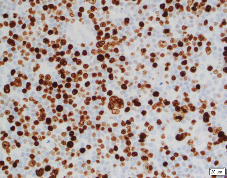 Immunohistochemical studies show that the vast majority of the small-intermediate lymphocytes express B-cell markers CD20 (dim) and PAX5 and co-express CD5 and CD23 (subset). This is consistent with a background of CLL/SLL. The large atypical cells are positive for CD30, PAX5 and CD20 (variable). CD3 highlights numerous scattered background small T-cells, which are increased in the areas with the large cells. In situ hybridization for Epstein Barr viral RNA (EBER ISH) is mainly staining the large atypical cells. By Ki-67, the proliferation fraction is overall increased (40%) with increased uptake by the large atypical cells.