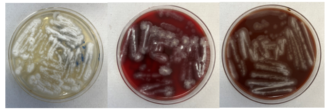 Abiotrophia is coined a NVS because this microorganism requires specific nutrients like L-cysteine or pyridoxal for growth on sheep’s blood agar. They can usually grow without supplementation on chocolate agar, brucella agar with 5% horse blood, and in thioglycolate broth. Sometimes sheep’s blood agar supplemented with pyridoxal can also be used. Due to the release of specific nutrients by lysed red blood cells, the satellite test is important for growth and identification. Briefly, the suspected isolate is streaked for confluent growth on an agar that does not support growth for Abiotrophia (such as sheep’s blood agar) and then overlaid with a cross streak of beta-hemolytic Staphylococcus aureus. After incubation, colonies of Abiotrophia can grow near the S. aureus streak, giving rise to the ‘satellite’ phenomenon. However, it should be noted that other fastidious organisms such as Granulicatella and some Haemophilus species can also satellite around the S. aureus streak. Hence, further confirmation is needed for identification. For example, Abiotrophia is non-motile. Common biochemicals reactions to help characterize Abiotrophia genus is PYR (production of pyrrolidonyl arylamidase) positive, LAP (production of leucine aminopeptidase) positive, and no growth in 6.5% NaCl.