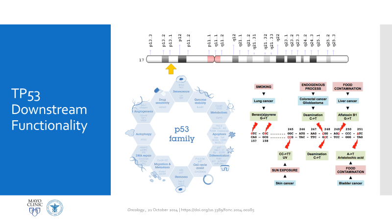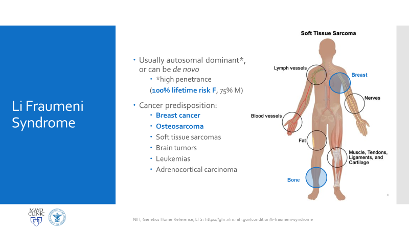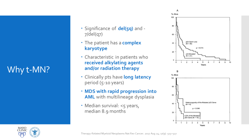 Essentially, this patient was found to have Li-Fraumeni after the second manifestation of an acute sarcoma—the first being osteosarcoma in her teenage years and the second breast cancer in her 30s. Both cancer diagnoses were treated accordingly, and this patient was going through routine work-up for anemia before being referred to the Mayo Clinic. By the time the patient reached there, the clinical investigation included a battery of testing for causes of anemia—all within normal limits—so a bone marrow examination was performed which revealed a significant, though not acute (<20% blasts), myelodysplastic process. A follow-up in-house bone marrow collection revealed hypercellular marrow, now in acute myeloid proliferation, with abnormal myeloid cell maturation and very complex cytogenetics. She had a very complex karyotype and several detectable mutations which were consistent with the WHO’s classification and description of therapy-related myeloid neoplasm as a sequale to the treatments she received for her prior cancers. In the setting of a patient with LFS, it is almost impossible to avoid malignancy. The following slides are a (very abridged) summary taken from my presentation of this patient’s case: