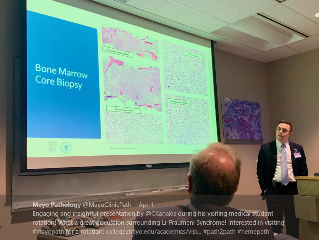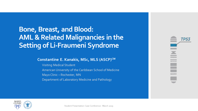 So, my presentation was intense! I’ve given plenty of case reports and conference discussions before, but this was an opportunity for me to explore quite a rare case in genetics and connect it with my interests in hematopathology. This was a case of a patient with Li-Fraumeni Syndrome (LFS) who developed therapy-related Acute Myeloid Leukemia. It’s not a current case and has since been signed-out and closed, but I’ll only be talking about the pathologic entities involved.