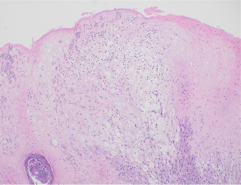 Recently, the histopathological description of 20 outbreak-associated clinical cases of Mpox from Spain was reported. Epidermal necrosis and keratinocytic ballooning were commonly encountered microscopic features associated with Mpox lesions.7 Figure 1 is a skin biopsy from a patient who presented with a vesicular eruption in September with a history of mpox, syphilis and herpes simplex infection whose lesions were worsening. It similarly shows ballooning degeneration, epidermal necrosis, exocytosis of neutrophils into the epidermis, and intracytoplasmic eosinophilic inclusions (Guarnieri bodies) (Figures 2-3).