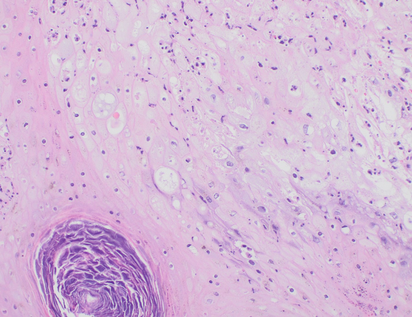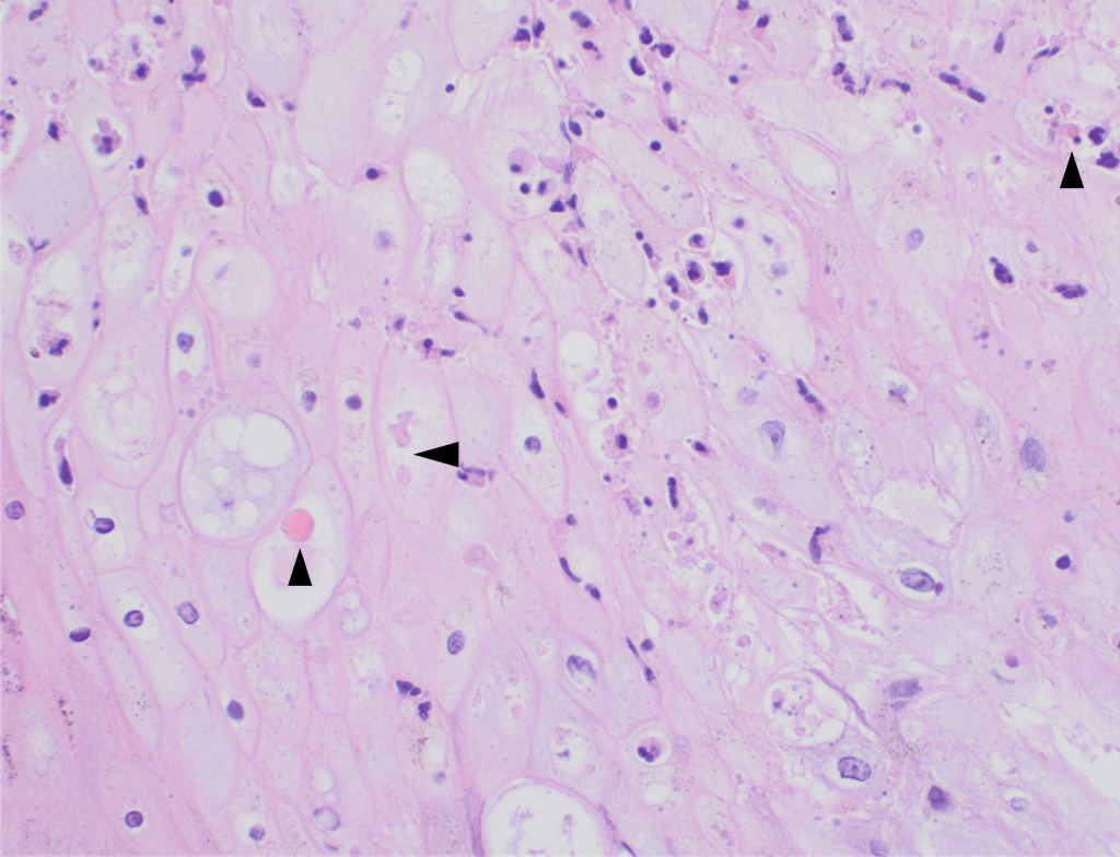 Figure 1. Histopathology of MPOX from a biopsied skin lesion (4x magnification, H&E). Intact epidermis with evidence of ballooning keratinocyte degeneration and infiltration of neutrophils.Figure 2. Histopathology of Mpox (10x magnification, H&E). Epidermis with a cross-section of follicular infundibulum (hair follicle) is in the bottom left. The keratinocytes to the right demonstrate marked vacuolar change and small eosinophilic bodies can be observed in a background of neutrophils and necrotic keratinocytes.Figure 3. Histopathologic findings of MPOX in a biopsy of a skin lesion (40x magnification, H&E). High power magnification of viral inclusions, guarnieri bodies, (arrowheads) in a background of necrotic keratinocytes and neutrophilic infiltrate.