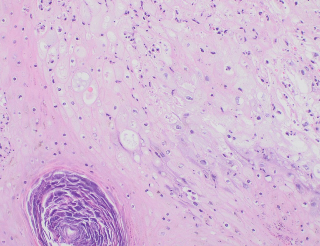 Although PCR testing is the mainstay of diagnosis, histopathologic evaluation of biopsy material from a lesion can also provide insight into the viral etiology. Mpox infected skin biopsies demonstrate similar histopathologic features of infections caused by other pox viruses. As the rash continues to evolve over time, representative histopathological changes can also be observed. Early lesions may demonstrate ballooning degeneration, acanthosis and spongiosis. More mature lesions progress to near total keratinocyte necrosis with exocytosis comprised of mixed cellular inflammatory infiltrate.6 Eosinophilic bodies may be identifiable in the cytoplasm of infected cells, commonly known as Guarnieri bodies, represent the mature virions produced in the cytoplasm of infected cells.