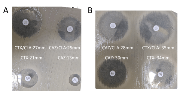 Figure 1. Disk diffusion test for ESBL detection. (A) A >5mm difference between the cefotaxime (CTX) and cefotaxime/clavulanic acid (CTX/CLA) disks, and ceftazidime (CAZ) and ceftazidime/clavulanic acid (CAZ/CLA) disks suggest a ESBL producer (top). (B) A <5 mm difference between CTX and CTX/CLA disks, and CAZ and CAZ/CLA does not suggest an ESBL-producer.