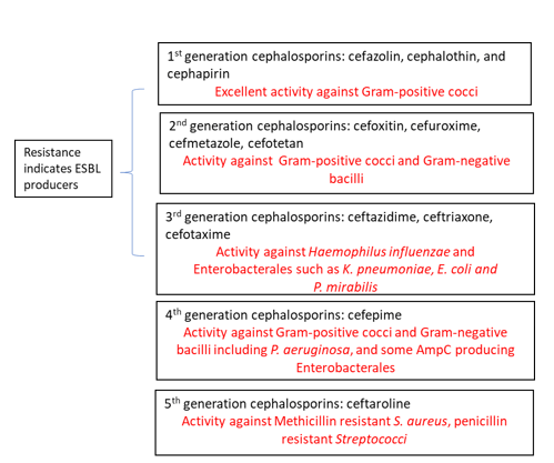 ESBLs are β-lactamases capable of conferring resistance to β-lactam antibiotics such as penicillins, first, second and third generation cephalosporins and aztreonam (but not cephamycins or carbapenems) (Table 1). A key characteristic is that these enzymes hydrolyze the antibiotics but are inhibited by β -lactamase inhibitors such as clavulanic acid, tazobactam and sulbactam. Thus, diagnostic assays utilize this key characteristic to develop tools to screen for ESBL producers as discussed below.1-3