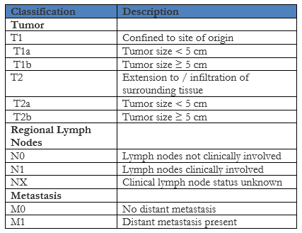 Gastric carcinoma is classified as either early or advanced stage to help determine the appropriate type of intervention. Early gastric carcinoma is defined as invasive carcinoma confined to the mucosa and/or submucosa, regardless of lymph node metastases or tumor size. These tumors are generally smaller, measuring less than 5 cm in size, and found most commonly on the lesser curvature of the stomach at the angularis. Histologically, early gastric carcinoma will commonly present as well differentiated, mostly with tubular and papillary architecture. If the biopsies are composed of only mucosa, then distinguishing between well-differentiated carcinoma and carcinoma in situ or high grade dysplasia can be difficult. The presence of stromal desmoplasia in invasive carcinoma can help differentiate it from intramucosal invasion, which can contain single tumor cells within the lamina propria. This is an important distinction to make as intramucosal carcinoma does metastasize. Advanced gastric carcinomas will present grossly as either exophytic, ulcerated, or infiltrative tumors. Histologically, advanced gastric carcinomas will invade the muscularis propria and demonstrate cytologic and architectural heterogeneity, with a combination of patterns.