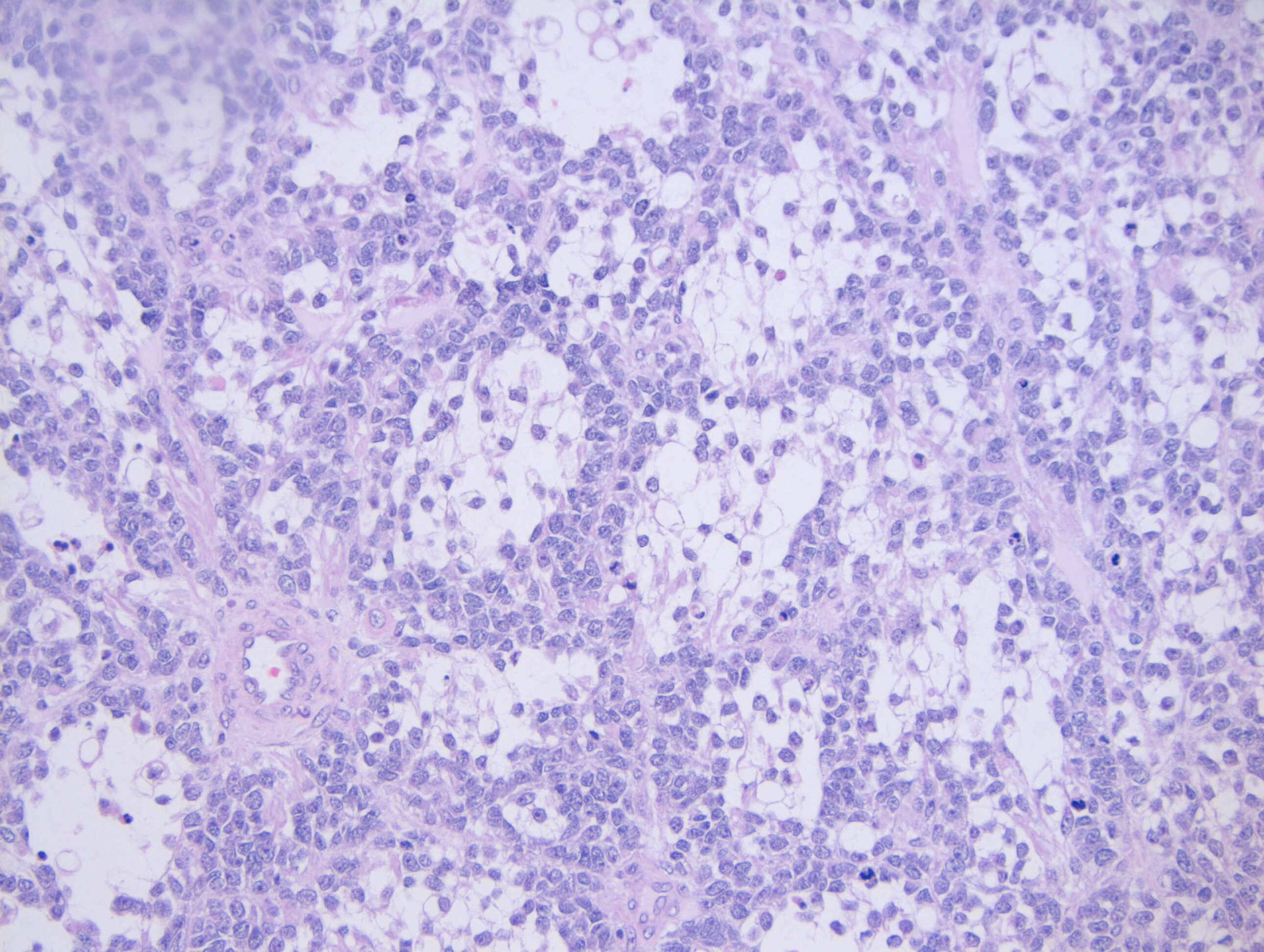 In PCGC, such as this case, it is generally diagnosed in younger patients without a gender bias. Although PCGC can be associated with an H. pylori infection, it is more commonly related to a mutation in the tumor suppressor gene epithelial cadherin, also known as E-cadherin and CDH1. PCGC presents as an infiltrative growth of poorly differentiated, discohesive malignant cells that appear to arise from the middle layer of the mucosa. These cells can infiltrate as individual cells or as small clusters, but usually do not form glands (Image 2). If the gastric wall becomes extensively infiltrated by malignancy, the wall can be thickened and rigid, a macroscopic presentation termed as linitis plastica, which can lead to pyloric obstruction. Within PCGC, numerous signet ring cells can be present, leading to SRC. There is also a hereditary form of poorly cohesive gastric cancer referred to as hereditary diffuse gastric carcinoma, with an autosomal dominant pattern of inheritance. Histologically, it will include hyperchromatic nuclei, occasional mitoses, patchy intramucosal signet ring cells in the lamina propria, and carcinoma in situ associated with pagetoid spread of tumor cells along the preserved basement membrane. Hereditary diffuse gastric carcinoma will present with multifocal tumors under an intact mucosal surface, making diagnosis difficult. In patients with a CDH1 mutation and a family history of gastric carcinoma, a prophylactic gastrectomy is often the recommended treatment option.