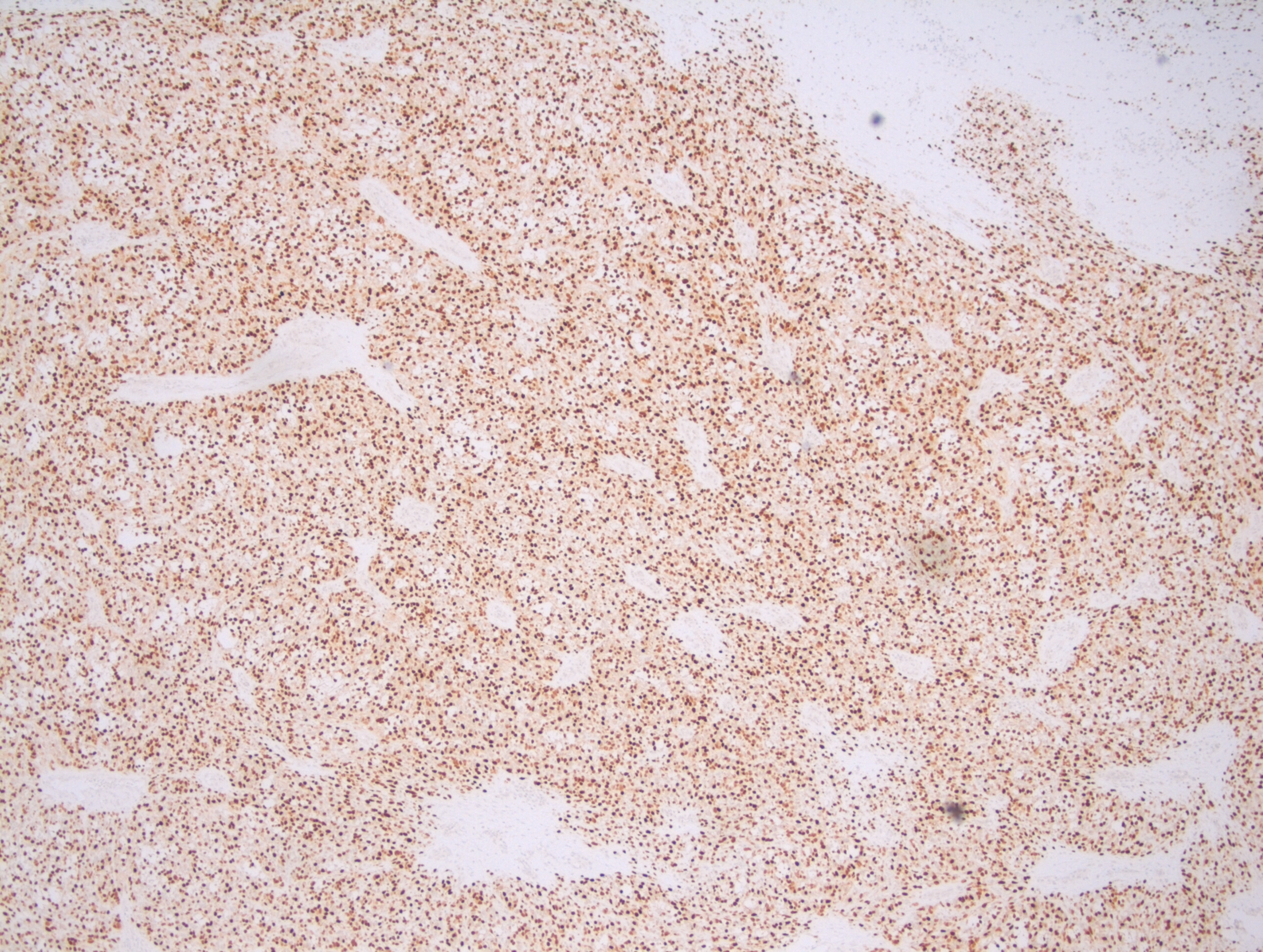 Histologically, the specimen consisted of diffuse, poorly differentiated, discohesive cells throughout all the layers of the stomach, penetrating into the serosa, with fibrosis, inflammation and signet ring cells present. In addition, angiolymphatic invasion was present. Based on the gross presentation and histologic appearance, the specimen was signed out as a diffuse gastric adenocarcinoma with a stage of T3.