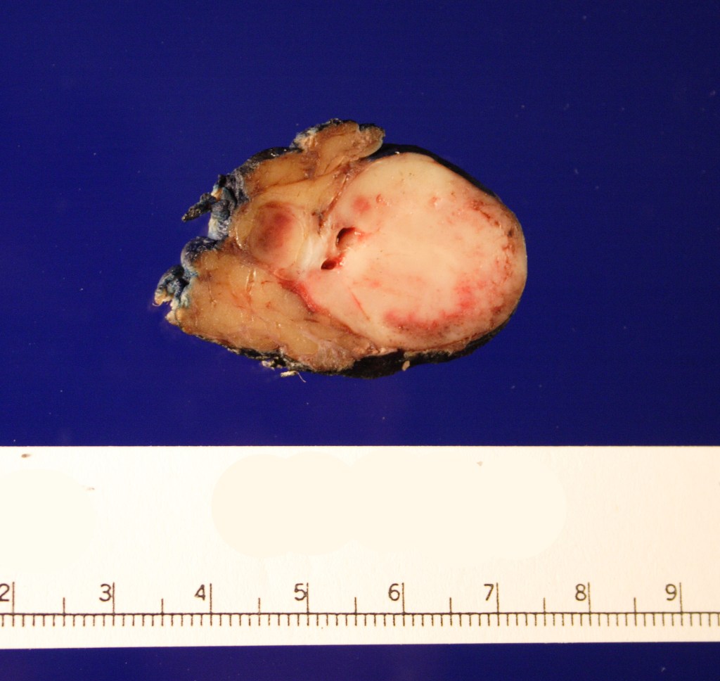 Received fresh for intraoperative consultation is a total gastrectomy specimen with a black stitch designating the proximal side. It was requested by the surgical team to have the proximal esophageal margin frozen to ensure that esophageal tissue was indeed present, as well as to exclude the presence of any carcinoma. The proximal margin was negative for carcinoma with squamous mucosa present. The stomach measures 17.0 cm in length with an internal circumference ranging from 14.7 cm proximally to 9.0 cm distally. There is a 1.0 cm long portion of attached duodenum with an internal circumference of 5.8 cm. The serosal surface of the stomach is glistening, pink-tan and smooth with a scant amount of attached yellow, lobulated adipose tissue and omentum along the length of one entire edge measuring 26.0 x 13.0 x 1.0 cm. The stomach is opened to reveal glistening, tan mucosa with irregular rugal folds which are diffusely nodular, predominantly in the body of the stomach. There is a 6.5 x 5.0 cm are of flattened mucosa in the pyloric region (Image 1). The wall thickness measures 0.5 cm throughout. There are no grossly identifiable masses or nodules. Gross images are taken and the serosal surface is inked entirely in black. The adipose tissue is examined for candidate lymph nodes. Representative sections are submitted as follows: